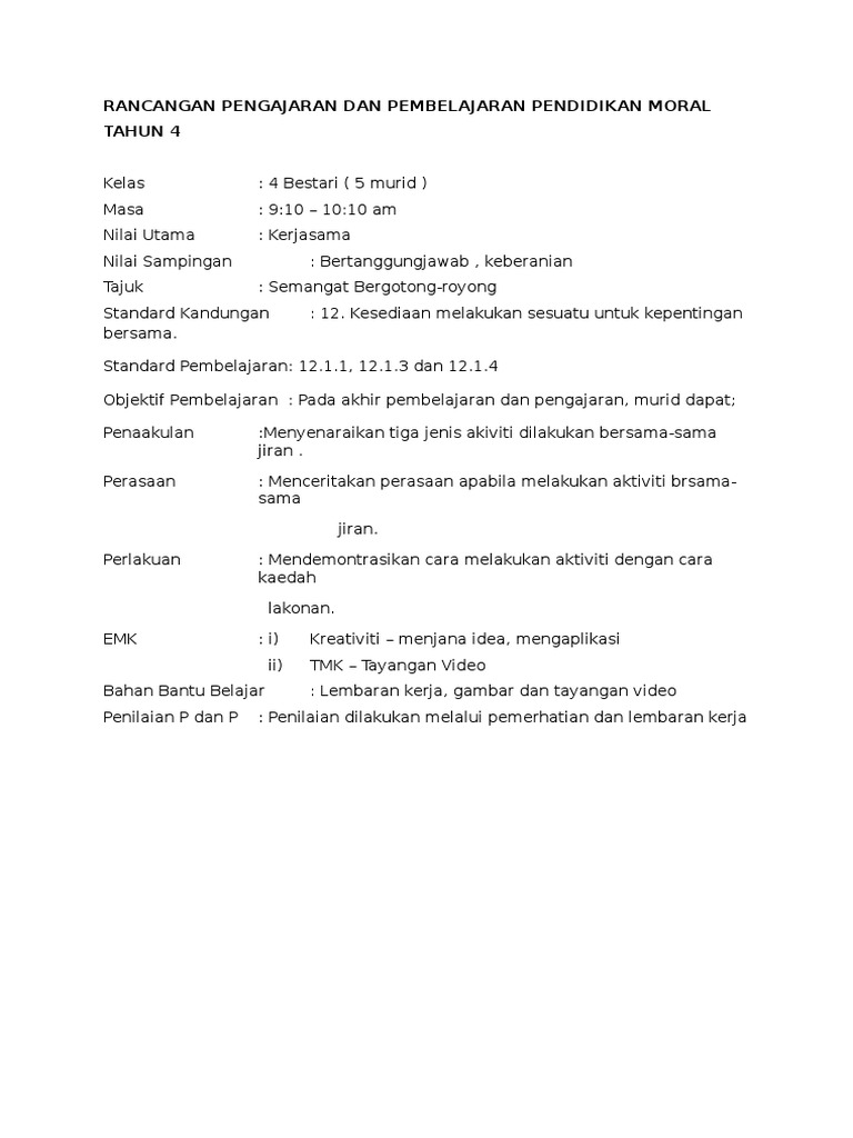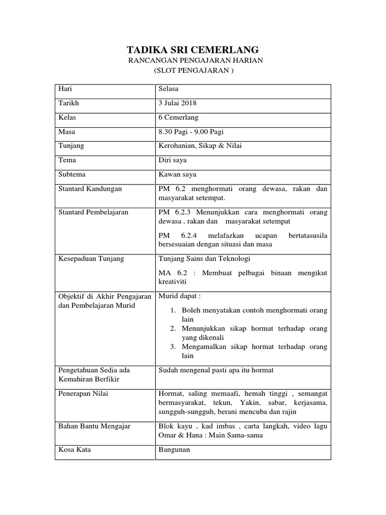 Contoh Rancangan Pembelajaran Kerohanian Moral Dan Nilai Bagi Prasekolah